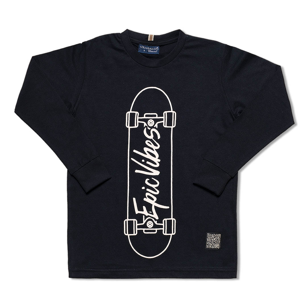 A estampa frontal com desenho de skate e a escrita “Epic Vibes” em branco traz personalidade ao look, sendo perfeita para composições casuais e estilosas.