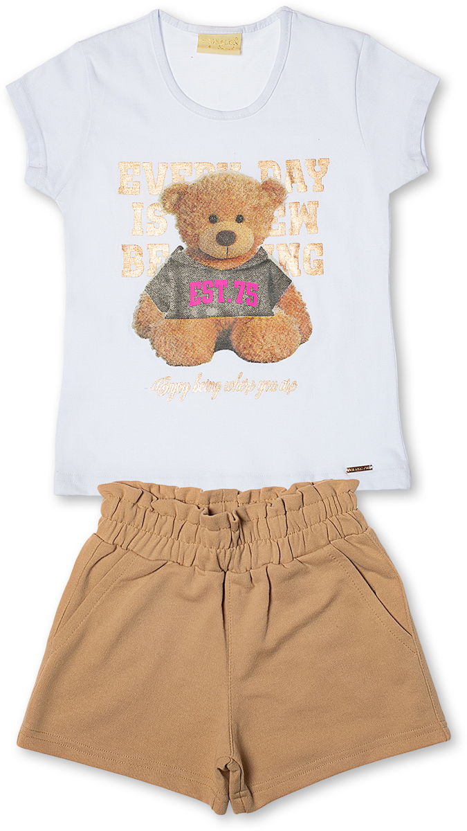 A blusa em algodão possui estampa exclusiva de urso com frase “Every Day is a New Beginning” com brilho, que transmite leveza e positividade. O shorts caramelo em moletinho leve tem cós alto com elástico franzido e bolsos laterais, garantindo um caimento perfeito e confortável.