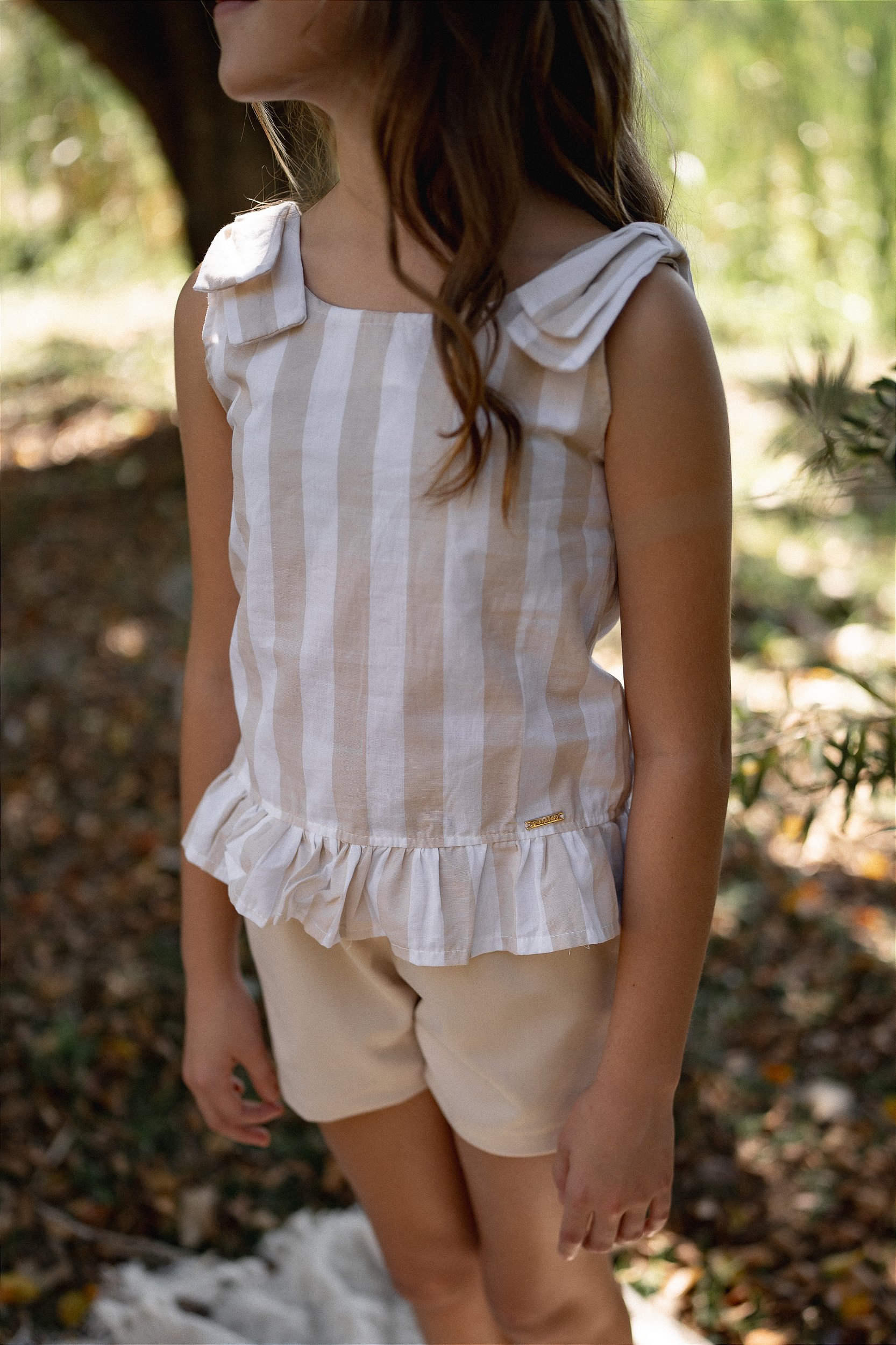 Encanto e leveza para os dias mais quentes! Esse conjunto infantil feminino é composto por uma blusa de algodão com listras em bege e branco, alças com laços decorativos e detalhe de babado na barra, trazendo um toque delicado e cheio de charme. O modelo conta ainda com elástico nas costas para melhor ajuste ao corpo. Acompanha um short de alfaiataria bege com cintura elástica franzida e bolsos laterais, garantindo conforto e liberdade para as pequenas aproveitarem cada momento com estilo.