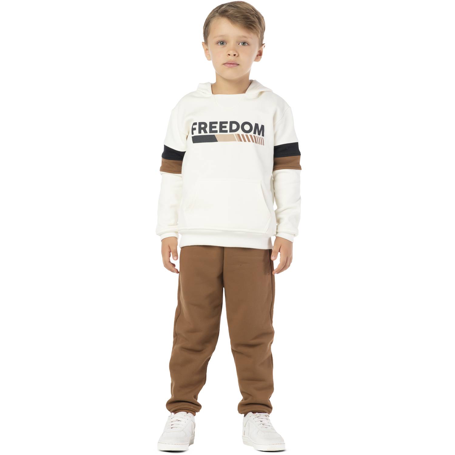 Perfeito pra quem não para um segundo, esse conjunto infantil masculino traz aquele mix de conforto, estilo e liberdade que os pequenos adoram! A blusa em moletom off-white tem capuz, bolso canguru pra guardar as descobertas do dia e uma estampa super descolada com a palavra “FREEDOM” que já diz tudo: é pra brincar, correr e se divertir livremente. As mangas têm detalhes em marrom e preto que deixam o visual ainda mais moderno. A calça, em moletom marrom nutella, vem com elástico na cintura e punhos na barra, garantindo aquele ajuste perfeito e muito conforto. Ideal pra acompanhar a criançada nos dias mais fresquinhos, seja na escola, no passeio ou na brincadeira, sempre cheio de atitude e estilo.