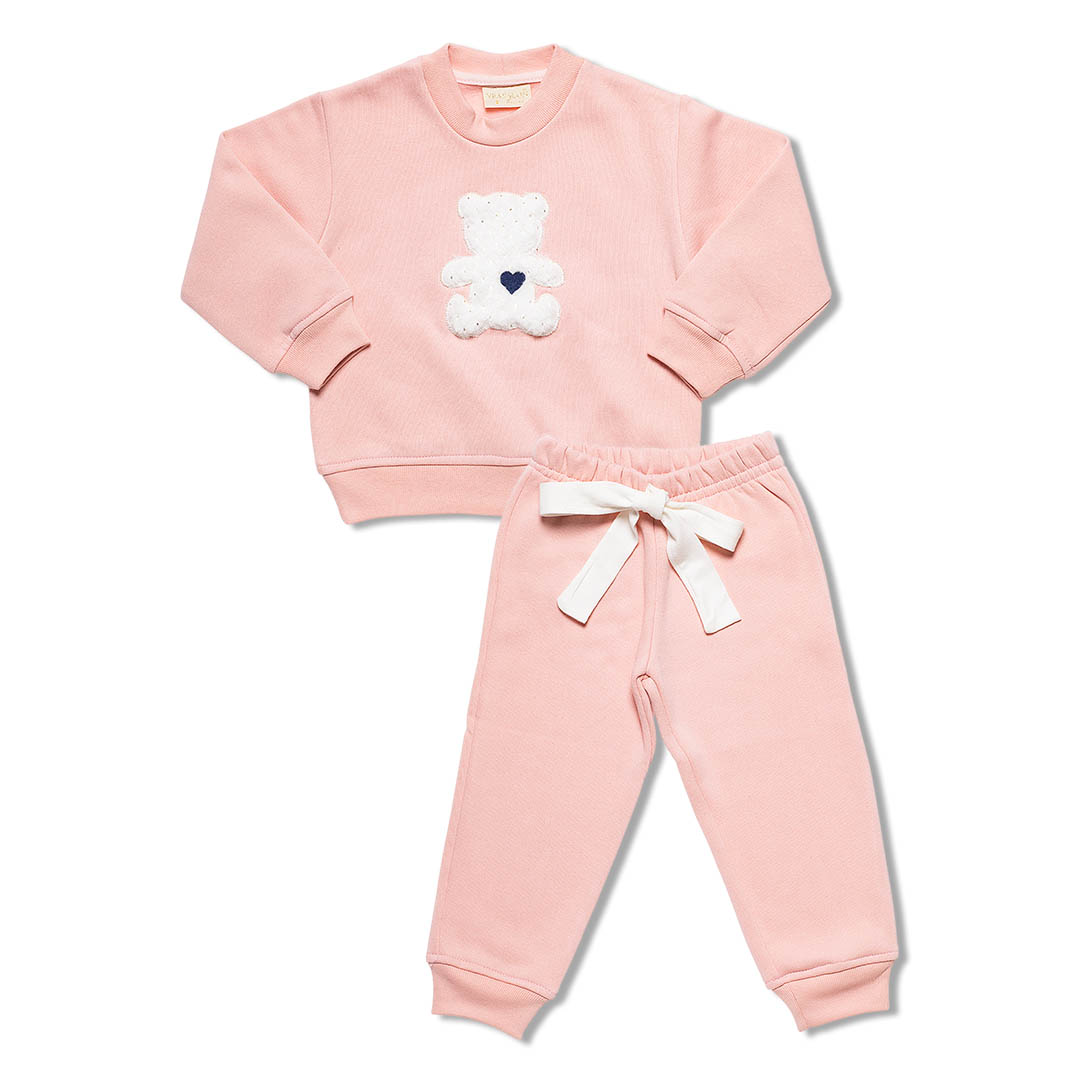 A blusa possui um delicado aplique de ursinha peluciada, trazendo um toque fofo e encantador à peça. Já a calça conta com um charmoso laço decorativo na cintura, que deixa o look ainda mais bonito e delicado.