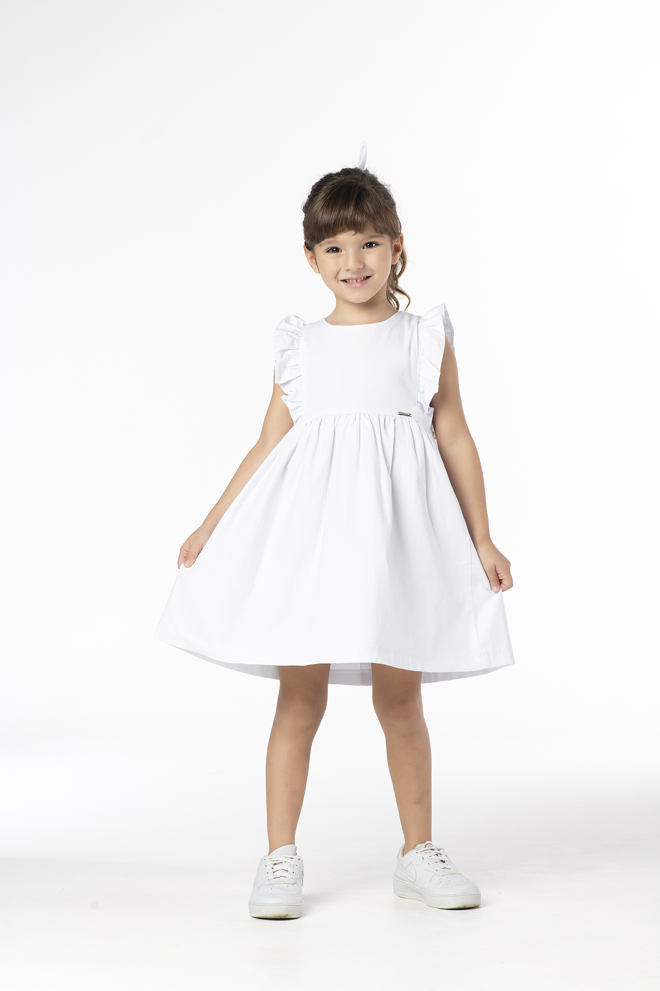 Vestido branco é sempre clássico e versátil. Com uma única peça, transmite feminilidade e modernidade para as meninas. Confeccionado em sarja, modelo conta com detalhe do babado nas mangas e abertura por zíper nas costas. Ideal para passeios aos finais de semana e ocasiões especiais